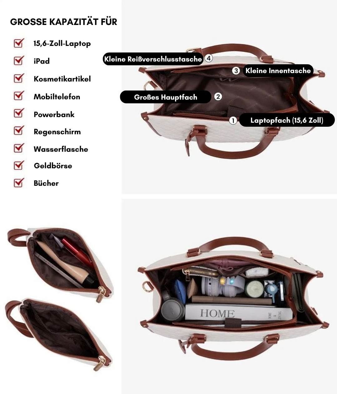 Diese elegante Laptoptasche bietet viel Platz für Laptop, iPad, Bücher, Kosmetikartikel und mehr. Mit durchdachtem Innenraum und modernem Design ist sie dein perfekter Begleiter für Arbeit, Uni und Reisen.