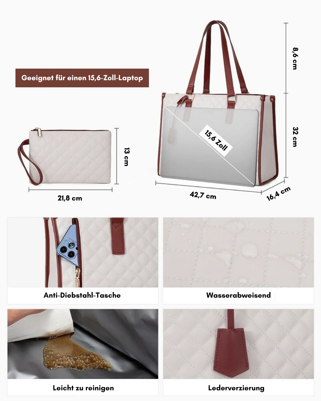 Diese Laptoptasche vereint elegantes Design mit praktischen Details: wasserabweisend, leicht zu reinigen und mit sicherer Anti-Diebstahl-Tasche. Ideal für unterwegs – robust, geräumig und stilvoll zugleich.